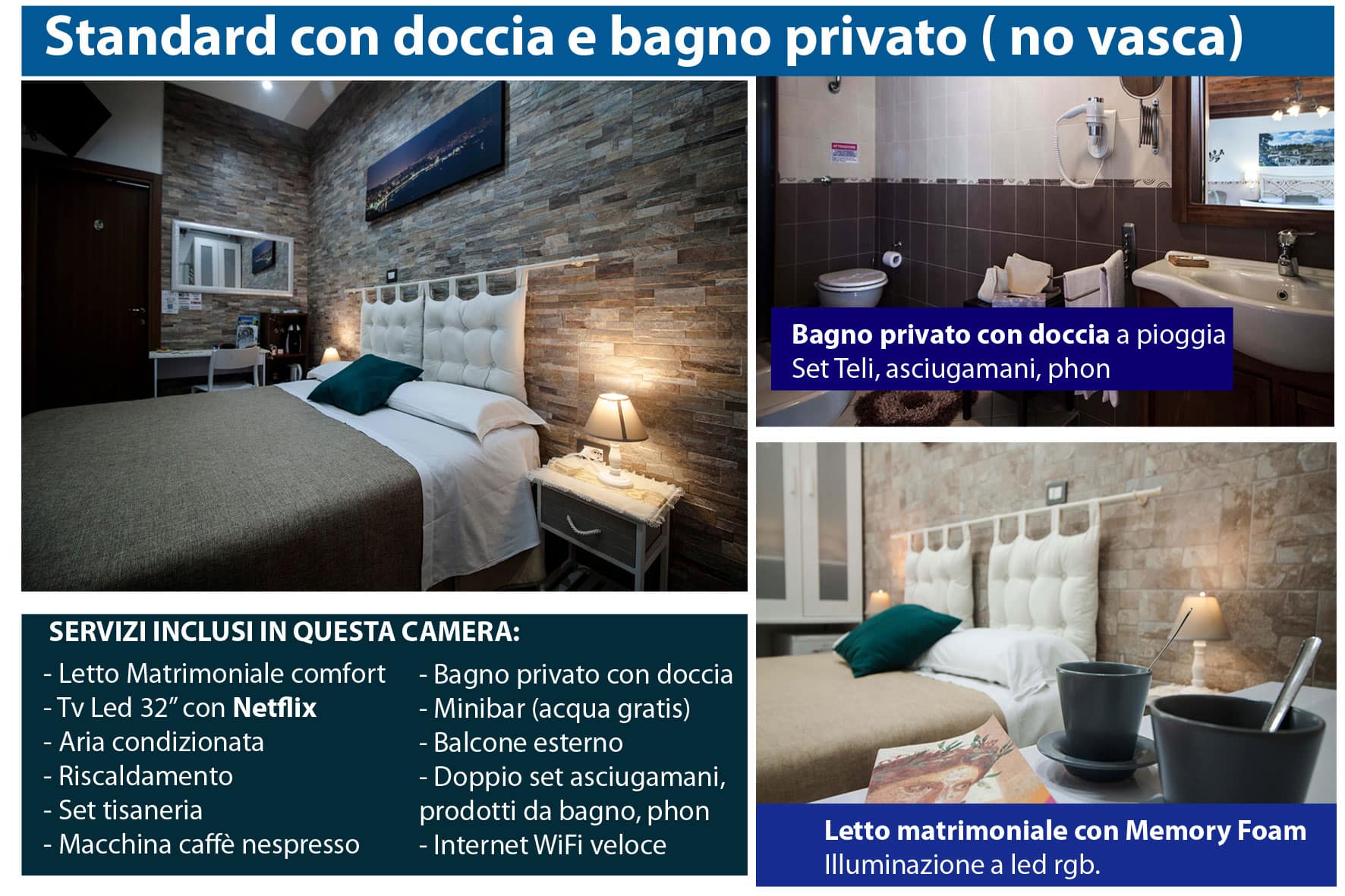 La camera dayuse standard con doccia e bagno privato è dotata di letto matrimoniale con materasso in memory foam, aria condizionata, Netflix, Wifi.
