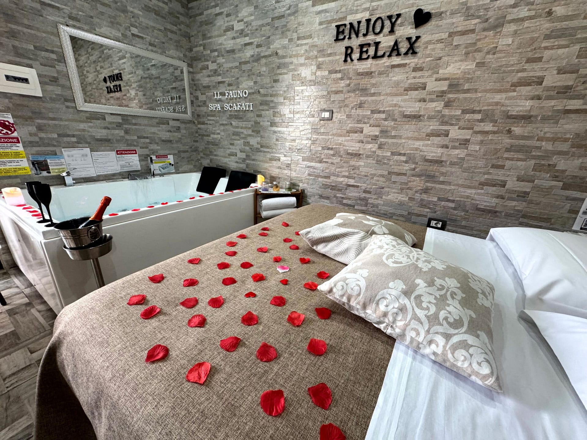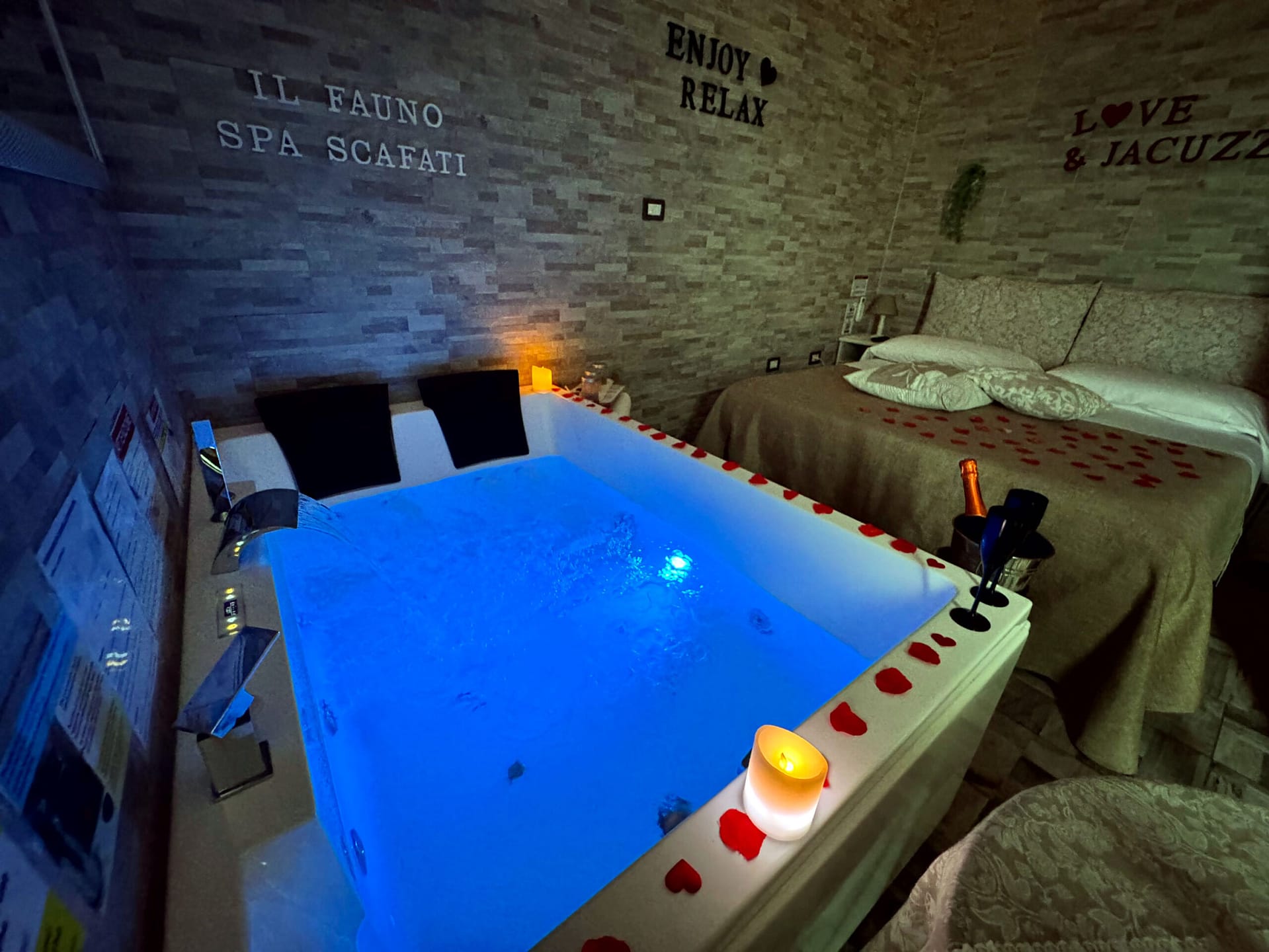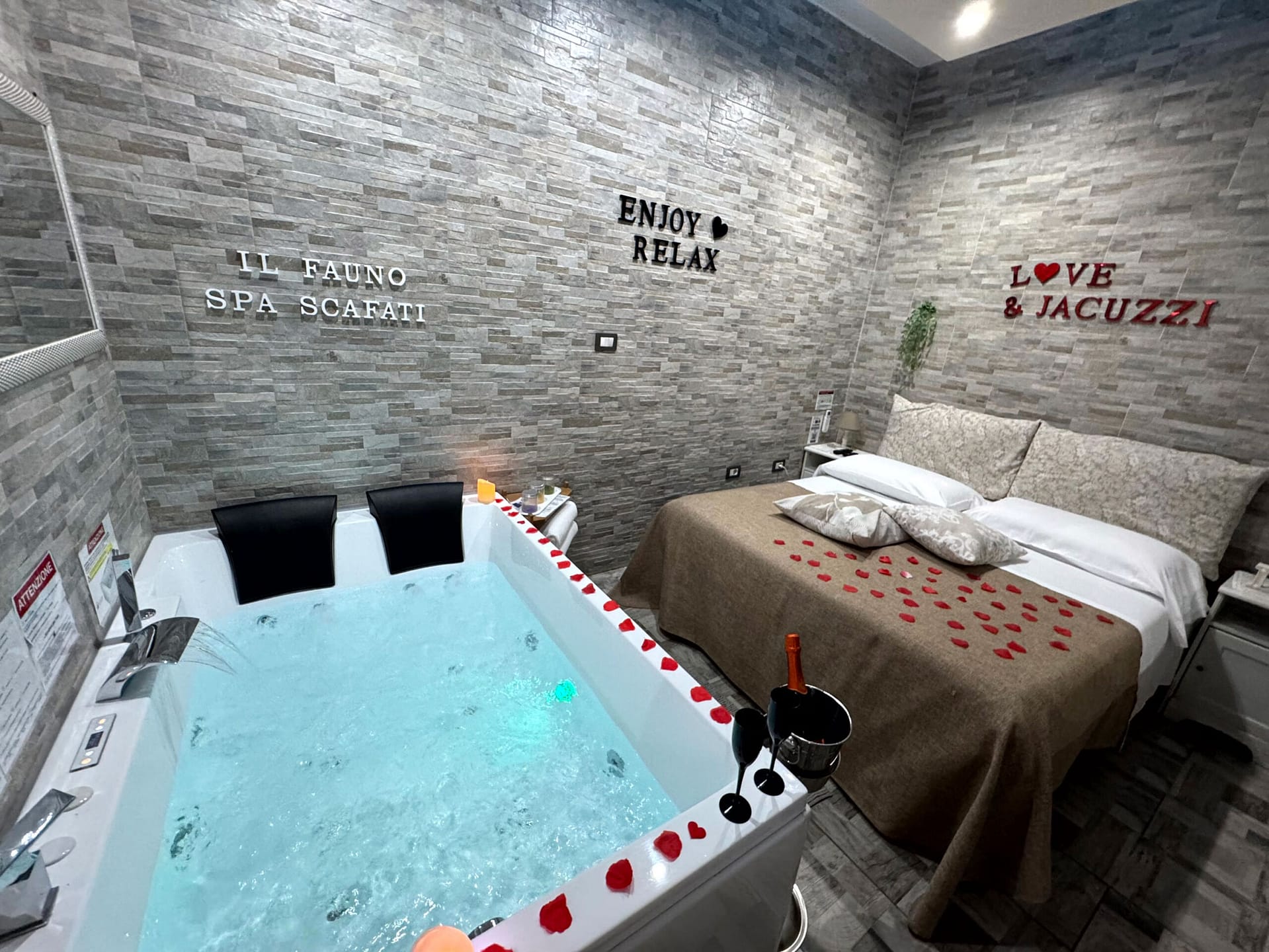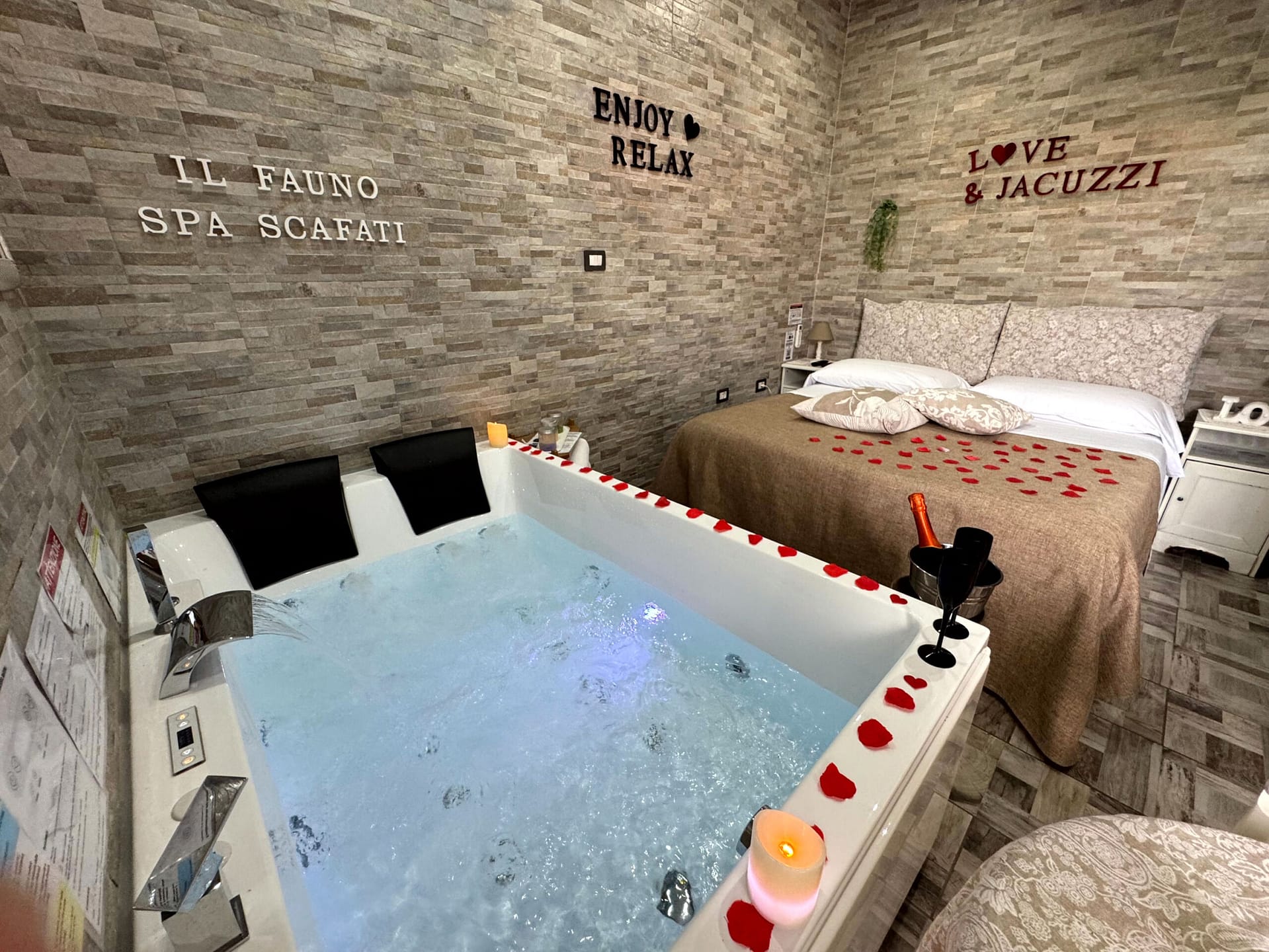 Suite con grande vasca idromassaggio biposto a bordo letto. Pensata per darti tutto ciò che hai sempre desiderato per il tuo relax. La vasca, di misure 180x120x61 cm, è dotata di 22 getti: 6 getti ad acqua grandi, 8 getti ad acqua piccoli, 8 getti ad aria sul fondo vasca. È dotata di 2 poggia testa, cromoterapia, sistema audio Bluetooth e casse acustiche.